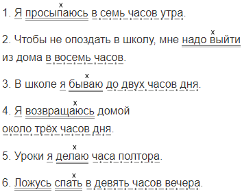 1. Когда ты просыпаешься? 2. В котором часу ты уходишь из дома в школу? 3. Как долго ты бываешь в школе? 4. Когда возвращаешься домой? 5. Как долго делаешь уроки? 6. В котором часу ложишься спать?