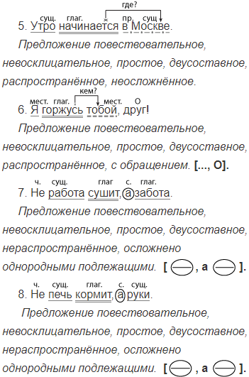 1. Ночь уход..т. 2. Поредел над сопками туман. 3. Реки и озёра засверкали. 4. Над Москвою розове..т дали. 5. Утро начинается в Москве. 6. Я горжусь тобой, друг! 7. Не работа сушит, а забота. 8. Не печь кормит, а руки.