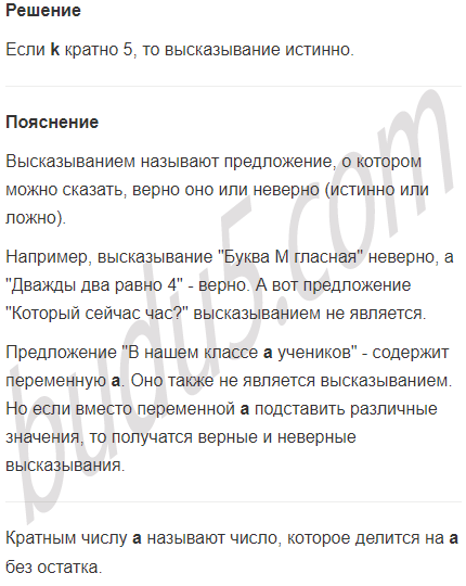 Задание № 2. Прочитай предложение с переменной k: "Число k делится на 5". При каких значениях k оно истинно, а при каких - ложно?
