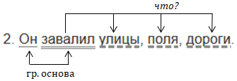 Это предложение повествовательное, невосклицательное, основа предложения - он (подлежащее), завалил (сказуемое). В предложении есть второстепенные члены, поэтому оно распространённое. Завалил (что?) улицы, поля, дороги - однородные дополнения, произносятся с интонацией перечисления.