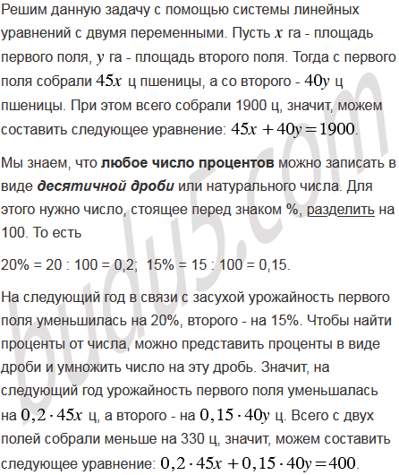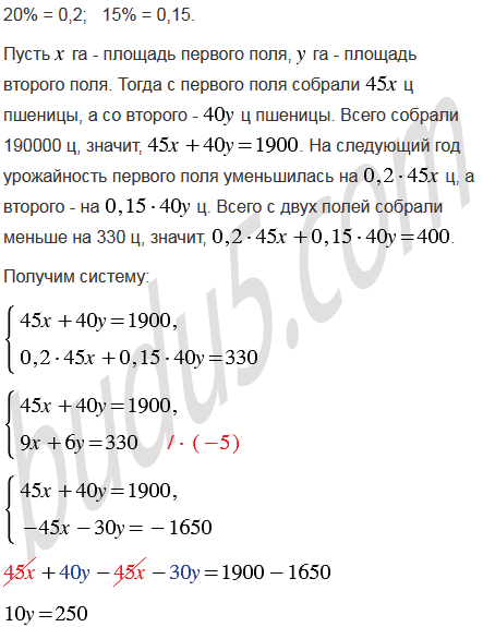 С одного поля собрали по 45 ц пшеницы с гектара, а с другого - по 40 ц с гектара. Всего собрали 1900 ц. На следующий год в связи с засухой урожайность первого поля уменьшилась на 20%, второго - на 15%, а в результате всего с двух полей собрали меньше на 330 ц. Найдите площадь каждого поля.