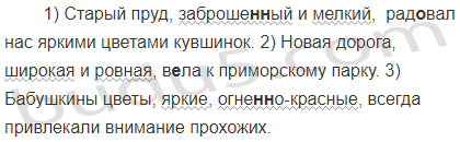 1) Старый пруд был заброше(н, нн)ый и мелкий, однако он рад..вал нас яркими цветами кувшинок. 2) Новая дорога была широкая и ровная, она в..ла к приморскому парку. 3) Бабушкины цветы были яркие, огне(н, нн)о-красные, что всегда привлекало внимание прохожих.