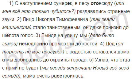 1) С наступлением сумер..к в лесу (ото)всюду раздавались стра(н, нн)ые звуки. 2) Лицо Николая Тимофеевича стало таинстве(н, нн)ым он даже понизил до ш..пота голос. 3) Выйдя на улицу мы (не)медле(н, нн)о промёрзли до костей. 4) Дед с радостью оставался дома а мы добирались до окра..ны города. 5) Узнав что отца с нами не будет мама очень ра(с, сс)троилась.
