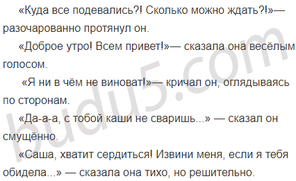 | «Куда все подевались?! Сколько можно ждать?!» «Доброе утро! Всем привет!» «Я ни в чём не виноват!» «Да-а-а, с тобой каши не сваришь...» «Саша, хватит сердиться! Извини меня, если я тебя обидела...» |