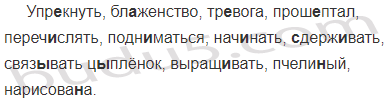 Упр..кнуть, бл..женство, тр..вога, прош..птал, переч..с лять, подн..маться, нач..нать, (с, з)держ..вать, связ..вать ц..плёнок, выращивать, пчели(н, нн)ый, нарисова(н, нн)а.