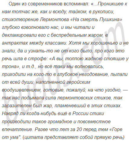 Один из современников вспоминал: ...Проникшее к нам тотчас же, как и всюду, тайком, в рукописи, стихотворение Лермонтова «На смерть Пушкина» глубоко взволновало нас, и мы читали и декламировали его с беспредельным жаром, в антрактах между классами. Хотя мы хорошенько и не знали, да и узнать-то не от кого было, про кого это речь шла в строфе: А вы, толпою жадною стоящие у трона, и т.д., но всё таки мы волновались, приходили на кого-то в глубокое негодование, пылали от всей души, наполненной геройским воодушевлением, готовые, пожалуй, на что угодно, — так нас подымала сила лермонтовских стихов, так заразителен был жар, пламеневший в этих стихах. Навряд ли когда-нибудь ещё в России стихи производили такое громадное и повсеместное впечатление. Разве что лет за 20 перед тем «Горе от ума".