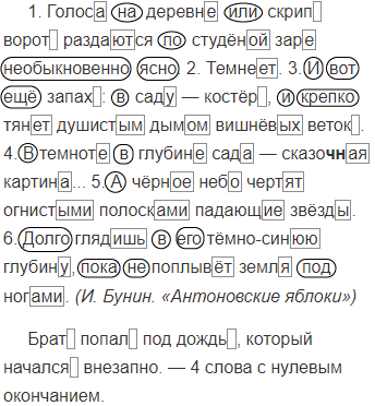 1. Голоса на деревне или скрип ворот раздаются по студёной6 заре необыкновенно ясно. 2. Темнеет. 3. И вот ещё запах: в саду — костёр, и крепко тянет душистым6 дымом вишнёвых веток. 4. В темноте в глубине сада — сказоч(?)ная картина... 5. А чёрное небо чертят огнистыми полосками падающие звёзды. 6. Долго глядишь в его тёмно-синюю глубину, пока не поплывёт земля1 под ногами. (И. Бунин. «Антоновские яблоки»)