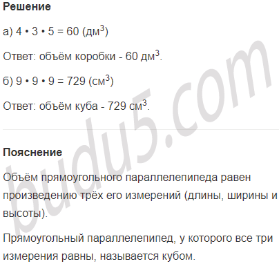 а) Длина коробки равна 4 дм, ширина - 3 дм, а высота - 5 дм. Чему равен объём этой коробки?