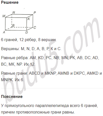 Задание № 2. На модели прямоугольного параллелепипеда покажи грани, рёбра, вершины. Сколько граней, рёбер и вершин? Имеются ли равные рёбра, грани? Покажи их и сосчитай.