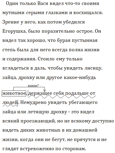 Один только Вася видел что-то своими мутными серыми глазками и восхищался. Зрение у него, как потом уб..дился Егорушка, было пор..зительно острое. Он видел так хорошо, что бурая пустынная степь была для него всегда полна жизни и содержания. Стоило ему только вглядет(т, ть)ся в даль, чтобы увидеть лисицу зайца дрохву* или другое какое(нибудь) животное держащ..е себя подальше от людей. Немудрено увид..ть убегающего зайца или летящую дрохву - это видел всякий проезжающий, но не всякому доступно вид..ть диких животных в их домашней жизн.., когда они (не)бегут1 (не)пряч..тся и (не)глядят встр..воженно по сторонам. А Вася вид..л игра..щих лисиц зайцев умыва..щихся лапками дрохв расправля..щих крылья, стрепетов, выбива..щих свои «точки». Благодаря такой остроте зрения, кроме мира, который вид..ли все, у Васи был ещё другой мир, свой собстве(н, нн)ый, (ни)кому не доступный и, вероятно, очень хороший.