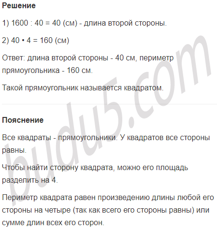 Задание № 4. Площадь прямоугольника равна 1600 см2, а одна из сторон - 40 см. Найди его вторую сторону и периметр. Как называется такой прямоугольник?
