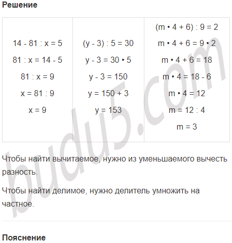| 14 - 81 : х = 5 | (у - 3) : 5 = 30 | (m • 4 + 6) : 9 = 2 |