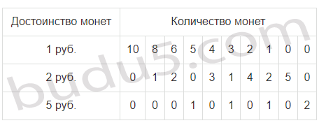 Задание № 13. Найди все способы размена 10 руб. монетами в 1 руб., 2 руб. и 5 руб.