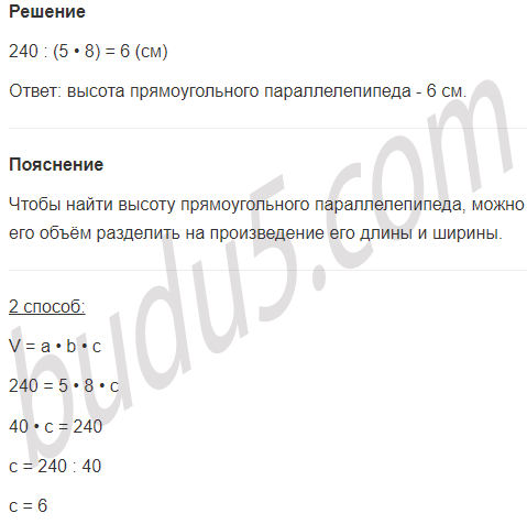 Задание № 6. Найди высоту прямоугольного параллелепипеда, если его объём равен 240 см3, а стороны основания - 5 см и 8 см.