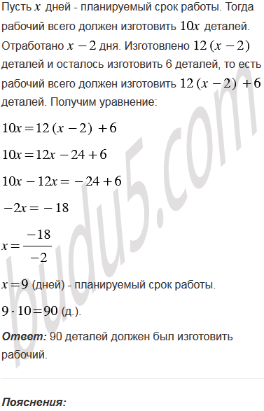 Рабочий должен был изготовлять ежедневно 10 деталей. Однако он изготовлял ежедневно 12 деталей, и уже за два дня до окончания срока работы ему осталось изготовить 6 деталей. Сколько деталей должен был изготовить рабочий?