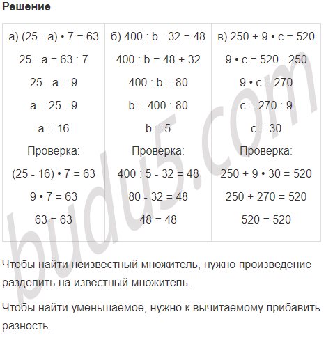 | а) (25 - а) • 7 = 63 | б) 400 : b - 32 = 48 | в) 250 + 9 • с = 520 |
