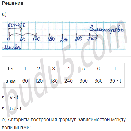 а) Из Москвы в Селижарово выехал автобус со скоростью 60 км/ч. Построй числовой луч и покажи на нём движение автобуса.