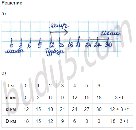 а) Определи по рисунку, откуда вышел турист, куда и с какой скоростью он идёт. Построй в тетради числовой луч и покажи на нём движение туриста.