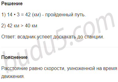 Задание № 3. Расстояние от деревни до станции 40 км. Всадник едет из деревни на станцию со скоростью 14 км/ч. Успеет ли он доскакать до станции за 3 часа?
