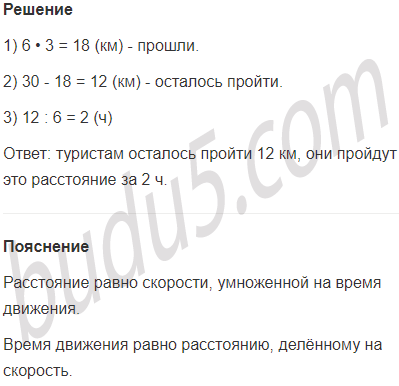 Задание № 4. Туристы решили пройти за день 30 км. Они уже прошли 3 ч со скоростью 6 км/ч. Какое расстояние им осталось пройти? За какое время они пройдут это расстояние, двигаясь с прежней скоростью?