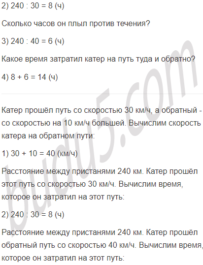 Задание № 4. Катер прошёл путь между двумя пристанями со скоростью 30 км/ч, а обратный путь - со скоростью на 10 км/ч большей. Расстояние между этими пристанями равно 240 км. Какое время затратил катер на путь туда и обратно?