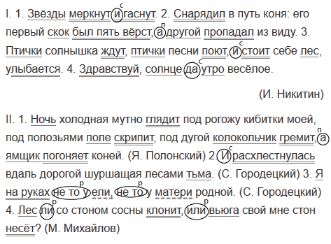 II. 1. Ночь холодная мутно глядит под рогожу кибитки моей, под полозьями поле скрипит, под дугой колокольчик гремит, а ямщик погоняет коней. (Я. Полонский) 2. И расхлестнулась вдаль дорогой шуршащая лесами тьма. (С. Городецкий) 3. Я на руках не то у ели, не то у матери родной. (С. Городецкий) 4. Лес ли со стоном сосны клонит, или вьюга свой мне стон несёт? (М. Михайлов)