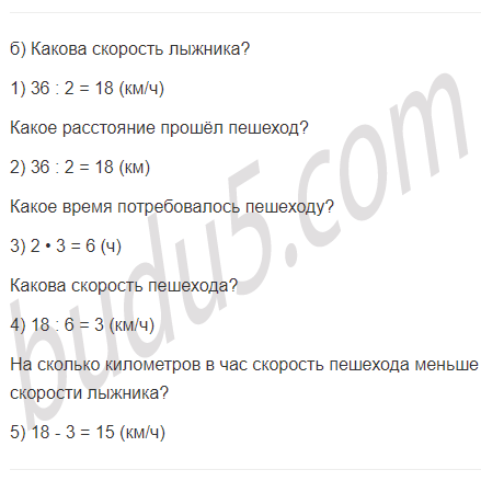 б) Лыжник пробежал 36 км за 2 ч, а пешеход прошёл половину этого расстояния за время в 3 раза большее. На сколько километров в час скорость пешехода меньше скорости лыжника?
