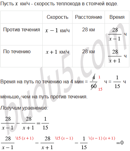 Теплоход прошел 28 км против течения реки и вернулся обратно, потратив на обратный путь на 4 мин меньше. Найдите скорость теплохода в стоячей воде, если скорость течения реки равна 1 км/ч.