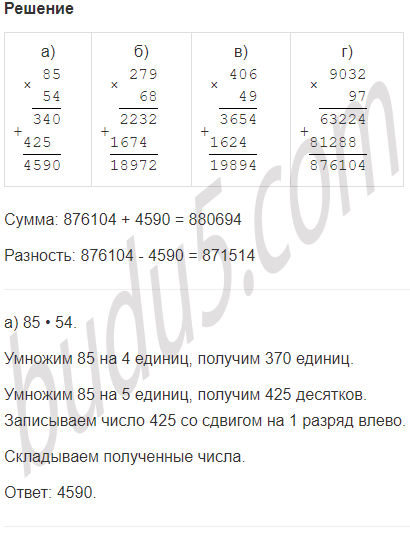 | а) 85 • 54 | б) 279 • 68 | в) 406 • 49 | г) 9032 • 97 |