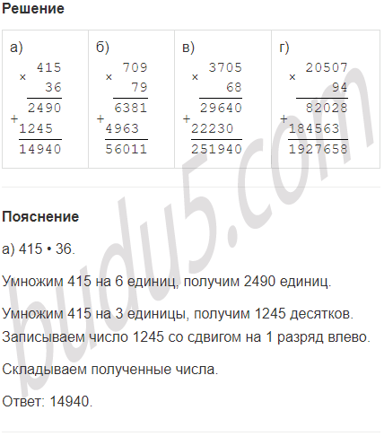 | а) 415 • 36 | б) 709 • 79 | в) 3705 • 68 | г) 20507 • 94 |