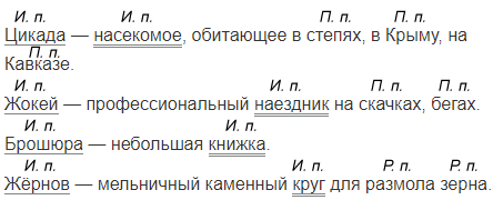 Пользуясь толковым словарём, запишите лексические значения слов ц..када, ж..кей, бр..шюра, ж..рнов. В записанных предложениях подчеркните главные члены. Какой частью речи они выражены? Обозначьте сокращённо падежи существительных. Объясните постановку тире.