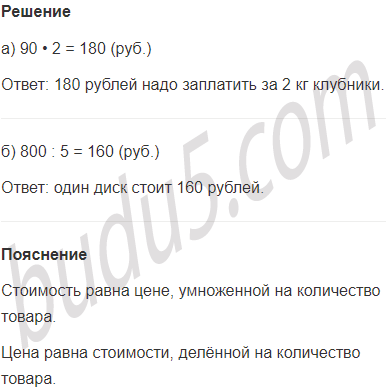Повтори денежную единицу - рубль, единицу массы - килограмм, единицу длины - метр, а также взаимосвязь между ценой, количеством и стоимостью.