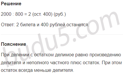 Задание № 5. Цена одного билета на поезд равна 800 руб. Сколько таких билетов можно купить на 2000 руб.? Сколько рублей ещё останется?