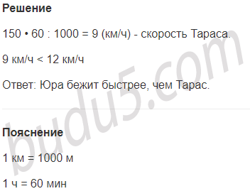 Задание № 12. Тарас бежит со скоростью 150 м/мин, а Юра - со скоростью 12 км/ч. Кто из них бежит быстрее?