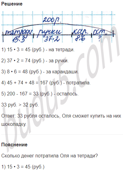 Задание № 9. У Оли было 200 руб. Она купила 3 тетради по цене 15 руб., 2 ручки по 37 руб. и 6 карандашей по 8 руб. Сколько денег у неё осталось: Сможет ли она купить на них шоколадку за 32 руб.?
