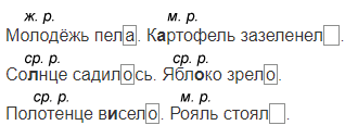 Молодёжь (петь). К..ртофель (зазеленеть). Со(?)нце (садиться). Ябл..ко (зреть). Полотенце (в..сеть). Рояль (стоять).