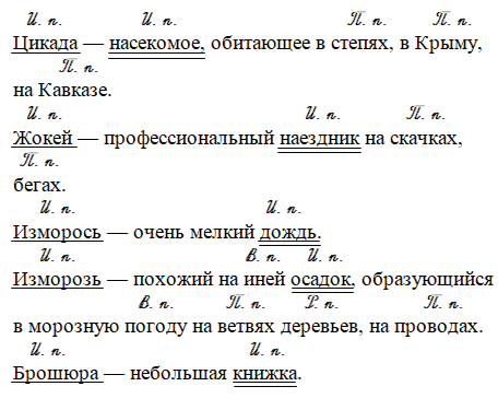 Пользуясь толковым словарём, запишите лексические значения слов цикада, жокей, изморось, изморозь, брошюра. В записанных предложениях подчеркните главные члены. Какой частью речи они выражены? Обозначьте сокращённо падежи существительных. Объясните постановку тире.