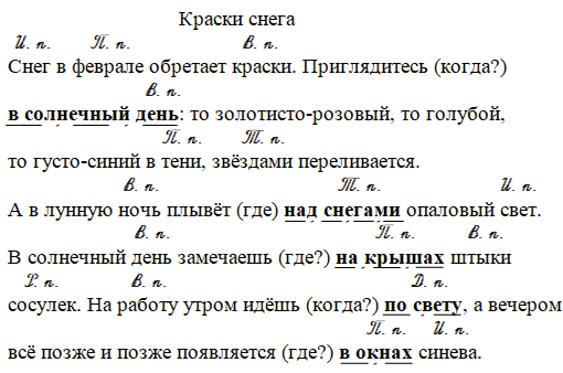 Прочитайте и озаглавьте текст. Спишите, вставляя пропущенные буквы. На месте скобок запишите смысловые вопросы к выделенным словам. Подчеркните выделенные слова как члены предложения. Обозначьте падеж всех имён существительных. Найдите существительные с предлогами, указывающими на время. Какова их роль в построении текста?