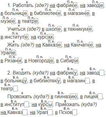 1. Работать на (фабрика, завод); в (больница, библиотека, магазин, музей, театр). Учиться в (школа, техникум, институт); на (курсы). Жить1 на (Кавказ, Камчатка, Урал); в (Рязань, Новгород, Сибирь).