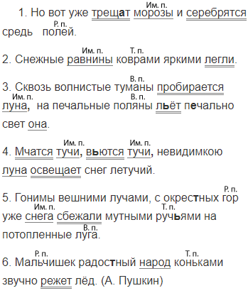1. Но вот уже трещ..т морозы и серебрят(?)ся средь полей. 2. Снежные равнины коврами яркими легли. 3. Сквозь волнистые туманы6 пробирает(?)ся луна на печальные поляны л(?)ёт печально свет она. 4. Мчат(?)ся тучи в(?)ются тучи невидимкою луна освещ..ет снег летучий. 5. Гонимы вешними лучами, с окрес(?)ных гор уже снега сбежали мутными руч(?)ями на потоплённые луга. 6. Мальчишек радос(?)ный народ коньками звучно режет лёд. (А. Пушкин)