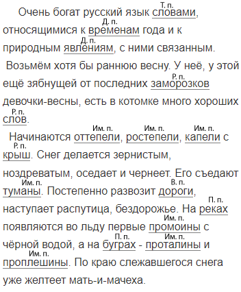 Начинаются оттепели, ростепели, капели с крыш. Снег делает(?)ся зернистым, ноздреватым2, оседает и чернеет. Его с(?)едают туманы. Постепенно ра..возит дороги, наступает ра..путица, бе..дорожье. На реках появляют(?)ся во льду первые промоины с чёрн..й водой, а на буграх - проталины и проплешины. По краю слежавшегося снега уже желтеет мать-и-мачеха.