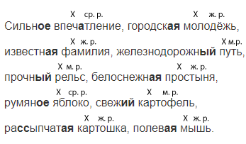 Сильн.. впеч..тление, городск.. молодёжь, известн.. фамилия, железнодорожн.. путь, прочн.. рельс, белоснежн.. простыня, румян.. яблоко, свеж.. картофель, ра(с, сс)ыпчат.. картошка, полев.. мышь.