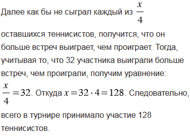 По окончании теннисного турнира, который проводился по олимпийской системе (проигравший выбывает), оказалось, что только 32 участника выиграли больше встреч, чем проиграли. Сколько теннисистов принимало участие в турнире?