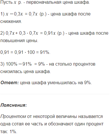 Цену шкафа снизили на 30%, а спустя некоторое время повысили на 30%. Как изменилась, увеличилась или уменьшилась, цена шкафа по сравнению с первоначальной и на сколько процентов?