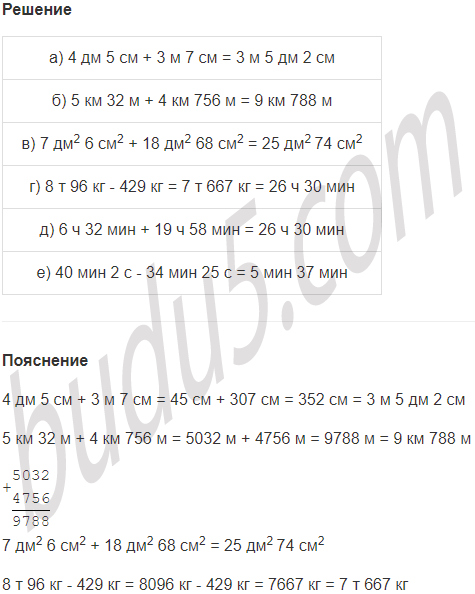 | а) 4 дм 5 см + 3 м 7 см | г) 8 т 96 кг - 429 кг |