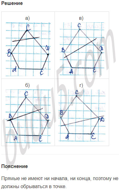 Задание № 10. Начерти пятиугольник ABCDE и проведи прямую l так, чтобы она разбила пятиугольник: а) на треугольник и шестиугольник; б) на треугольник и пятиугольник; в) на четырёхугольник и пятиугольник; г) на два четырёхугольника.