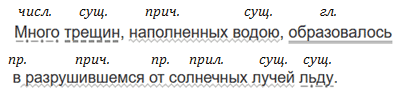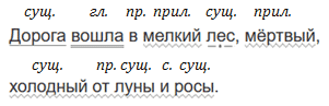 1) Дорога вошла в мелкий лес мёртвый холодный от луны и росы.4 (И. Бунин) 2) Звуки музыки весёлые радостные доносились с большого парохода. (К. Станюкевич) 3) Много трещин наполн..ных водою образовалось в разрушившемся от солнечных лучей льду.4 (И. Соколов-Микитов) 4) Мы утомлё..ые3 только к восьми часам вернулись с охоты. (М. Пришвин) 5) Большие и (не)уклюжие на земле аисты были легки и красивы в небе. (А. Сергеев-Ценский) 6) Донельзя довольный своим выступлением дед Щукарь устало опустился на скамью. (М. Шолохов) 7) Мелкий дождь предвестник осени кропит землю. (М. Горький) 8) Дальше прост..ралась пустыня бесконечные ж..лтые просторы песков. (Ю. Нагибин) 9) У раннего грача разведчика много хлопот. (Г. Троепольский) 10) Со времён Ермака русские люди одержимые страстью познания двигались на Восток. Двигались с Цны голубки Десны кр..савицы Волги матушки. (Газета) 11) К нам спускается Иван Иванович Тишкин астроном. (Г. Федосеев) 12) Лермонтов прозаик это чудо это то к чему мы должны стреми(т, ть)ся. (Л. Н. Толстой) 13) Художник никогда раньше не видел такого разнообразия красок. (К. Паустовский) 14) На бугре берёза свечка в лунных перьях серебра. (С. Есенин)
