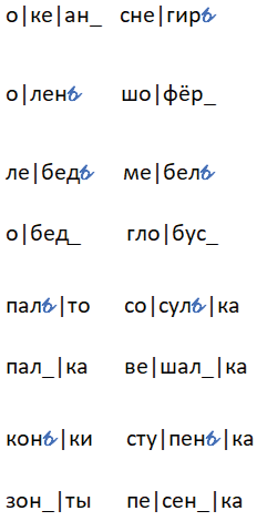 | ле|бедь | ме|бель | конь|ки | сту|пень|ки |