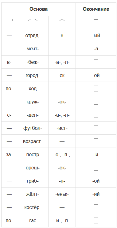 Отрядный, мечта, вб..жал, городской, поход, кружок, сделал, футболист, возр..ст, зап..стрели, ореш..к, грибной, ж..лтенький, к..стёр, пог..сил.