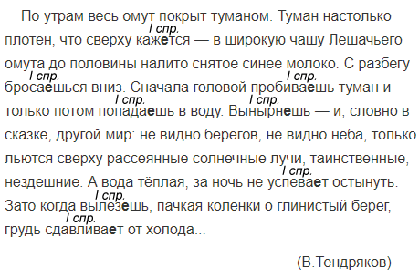 По утрам весь омут покрыт туманом. Туман настолько плотен, что сверху каж..тся — в широкую чашу Лешачьего омута до половины налито снятое синее молоко. С разбегу броса..шься вниз. Сначала головой пробива..шь туман и только потом попада..шь в воду. Вынырн..шь — и, словно в сказке, другой мир: не видно берегов, не видно неба, только льются сверху рассеянные солнечные лучи, таинственные, нездешние. А вода тёплая, за ночь не успева..т остынуть. Зато когда вылез..шь, пачкая коленки о глинистый берег, грудь сдавлива..т от холода...